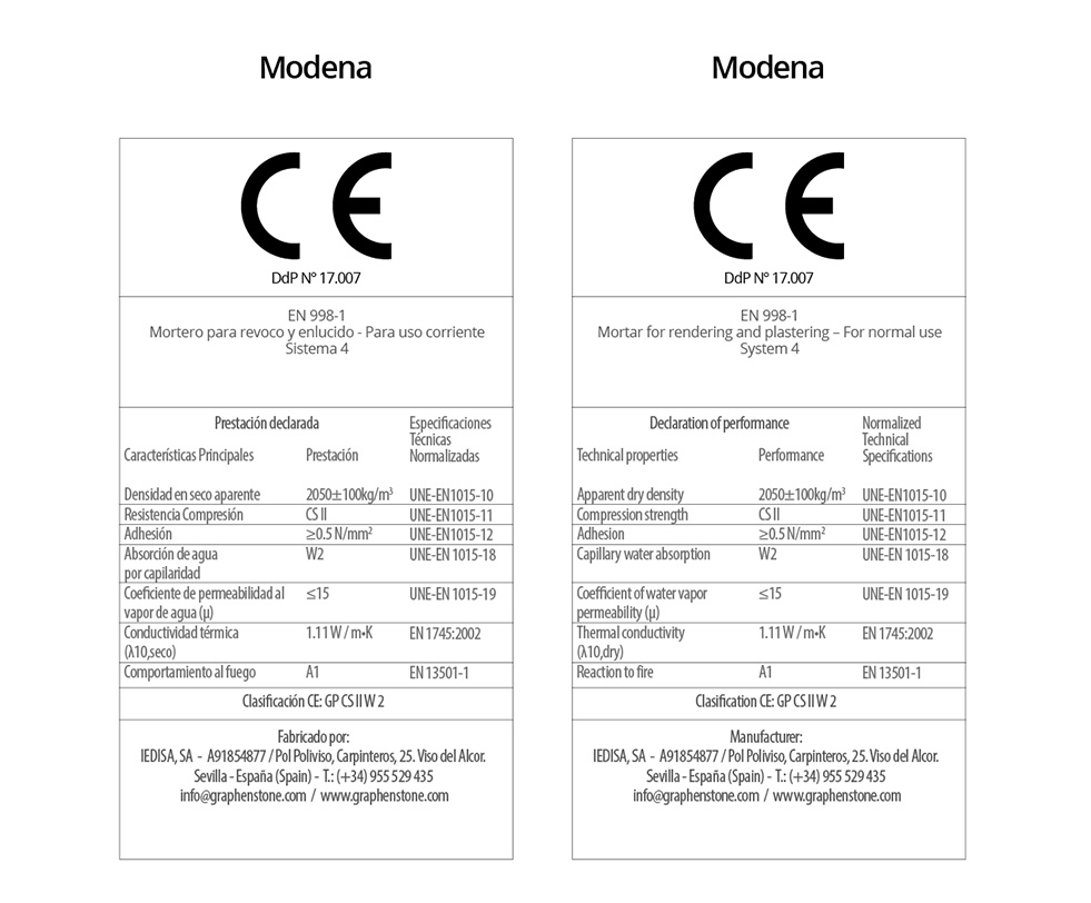 | In accordance with the Regulation (EU) No. 305/2011, a Quality Management System has been implemented in accordance with standard EN 998-1 on the specifications of mortars for rendering and plastering. | ||